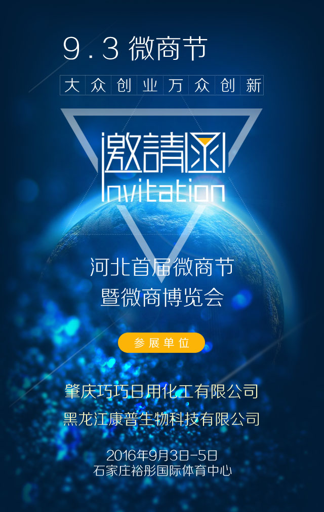 巧巧日化將攜手康普生物科技有限公司于2016年9月3日參加河北微商節(jié),歡迎廣大新老朋友屆時蒞臨指導(dǎo)。查看我們的產(chǎn)品,并與我們進行面對面的深入交流!
